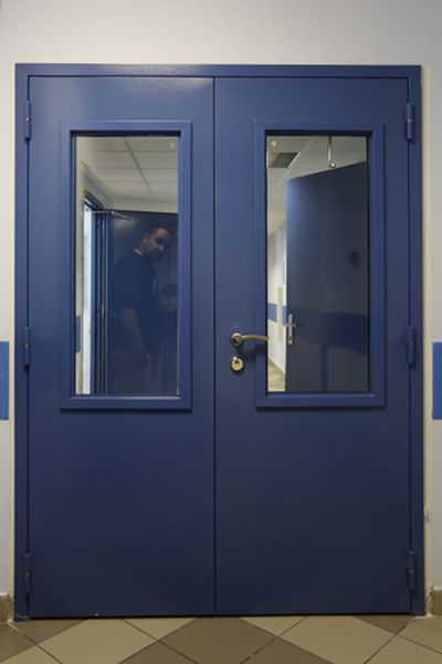Противопожарная алюминиевая дверь синего цвета в Мытищах