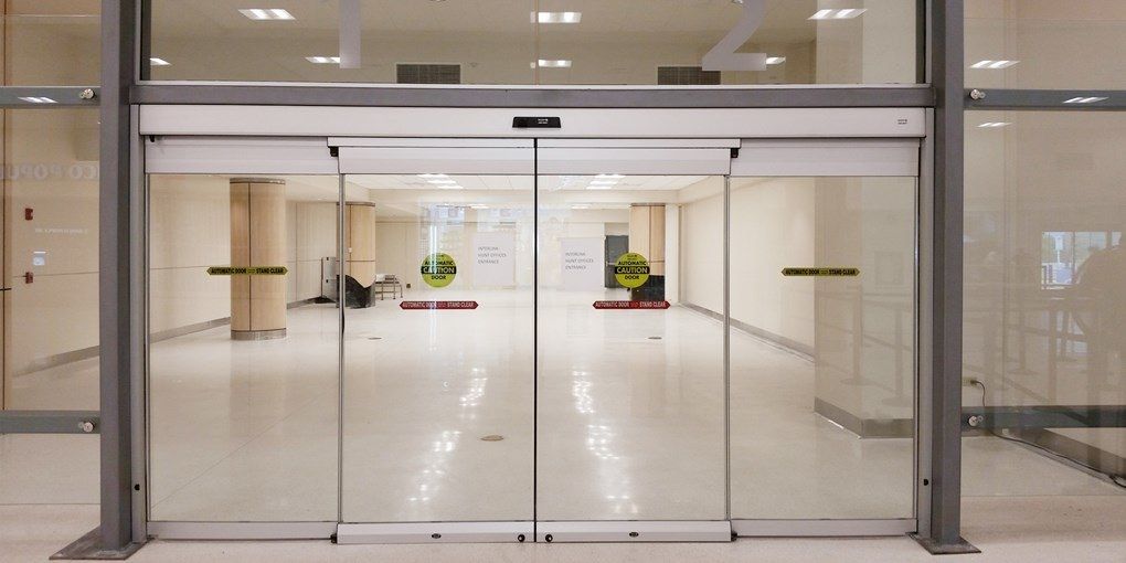 Противопожарная безрамная дверь со стеклом в бизнес центр в Мытищах