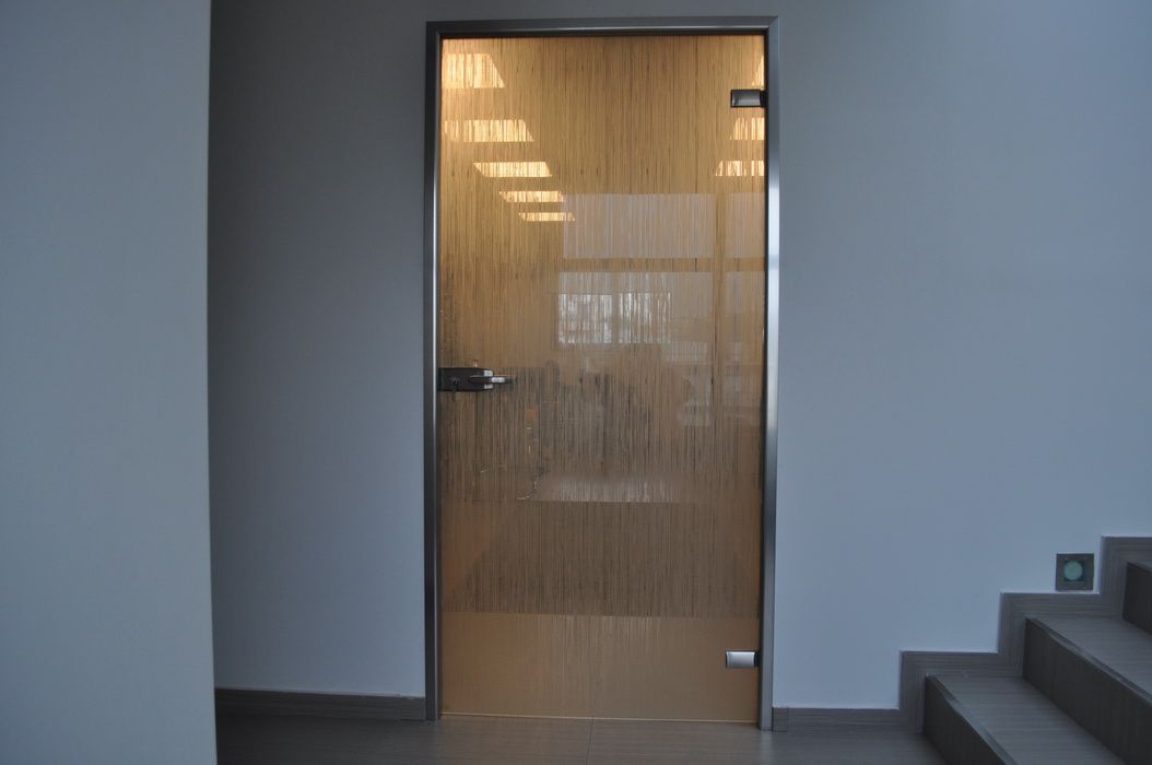 Противопожарная безрамная дверь со стеклом в БЦ в Мытищах